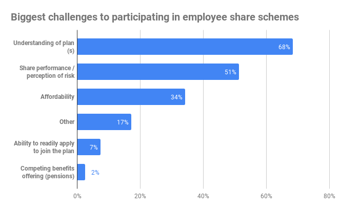 - Understanding the range of employee share schemes [68%], and understanding the concept of share performance and risk [51%] were cited by companies as the two biggest challenges they faced in operating a scheme.